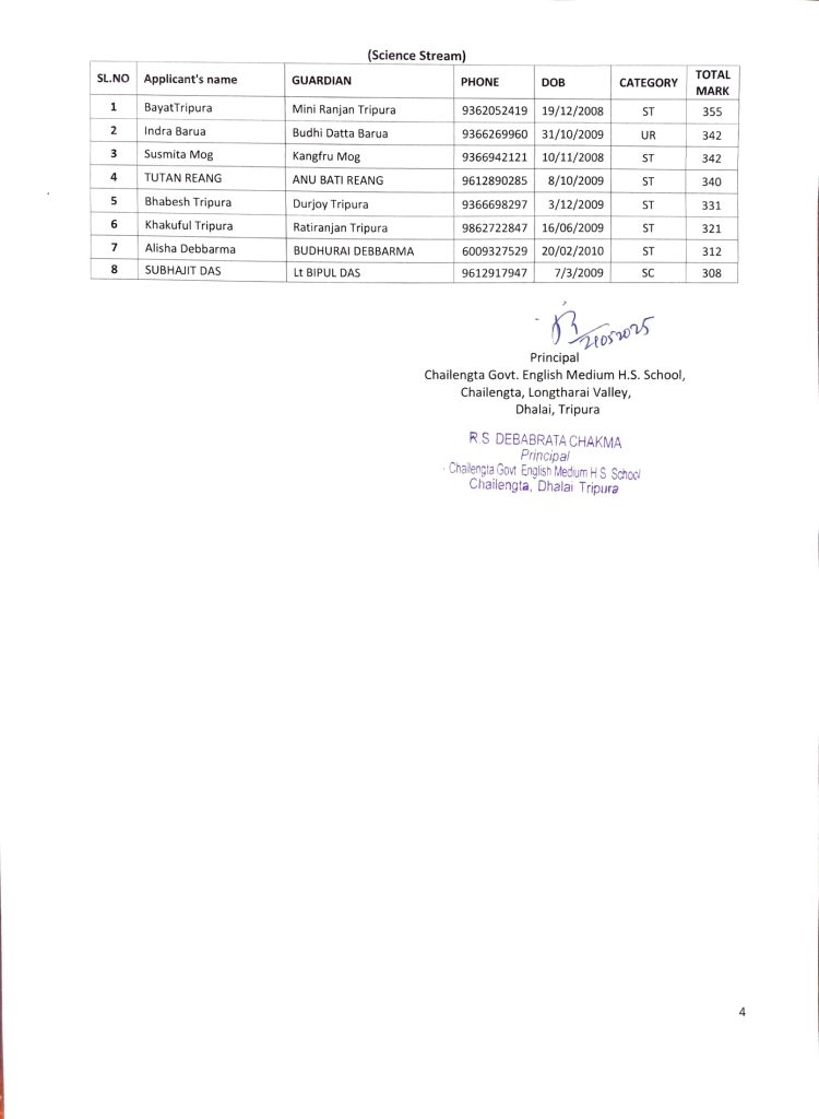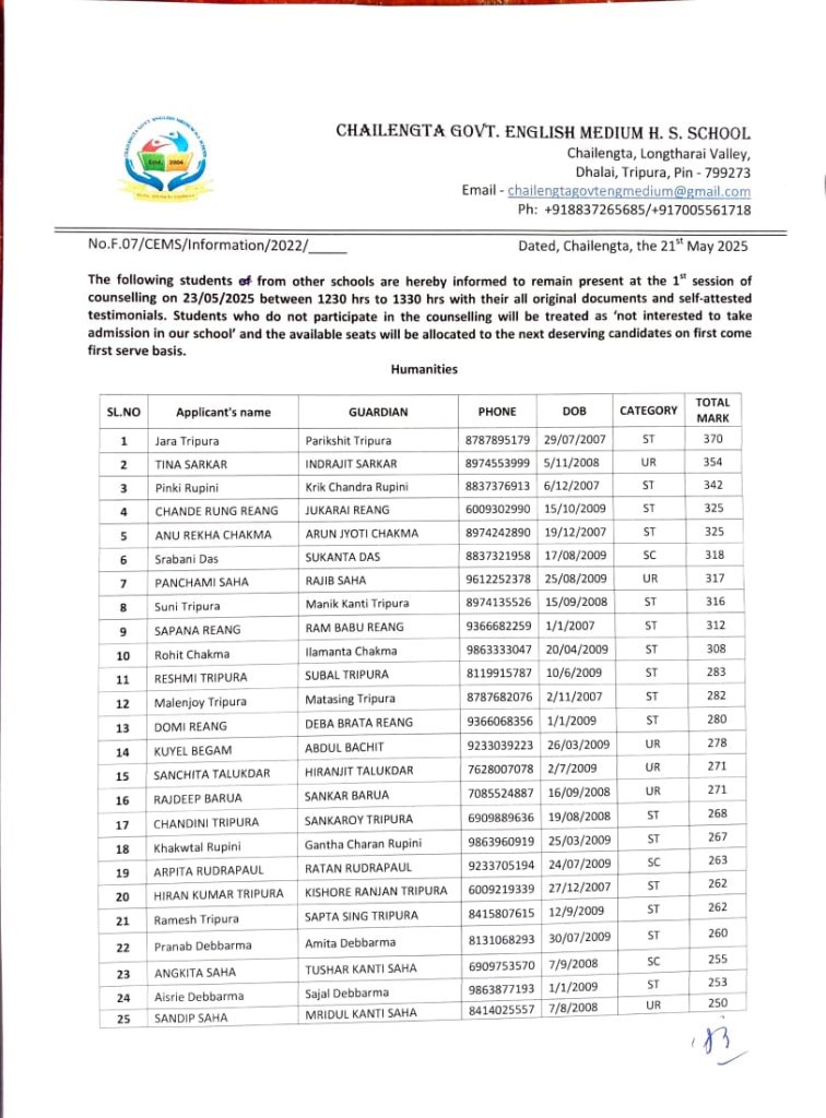 List of students for 1st Counselling of Admission in Class XI for the academic session 2025-26 (Own Students)